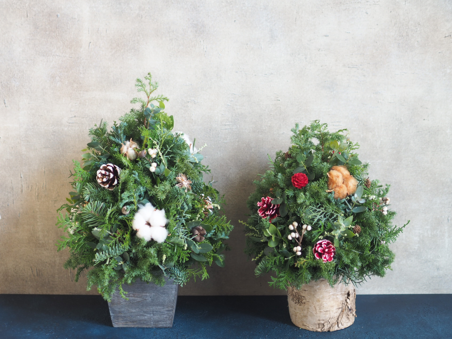 ①シンプル…針葉樹やグリーンのみで作ったシンプルな形のツリーです。飾り付けはありません。