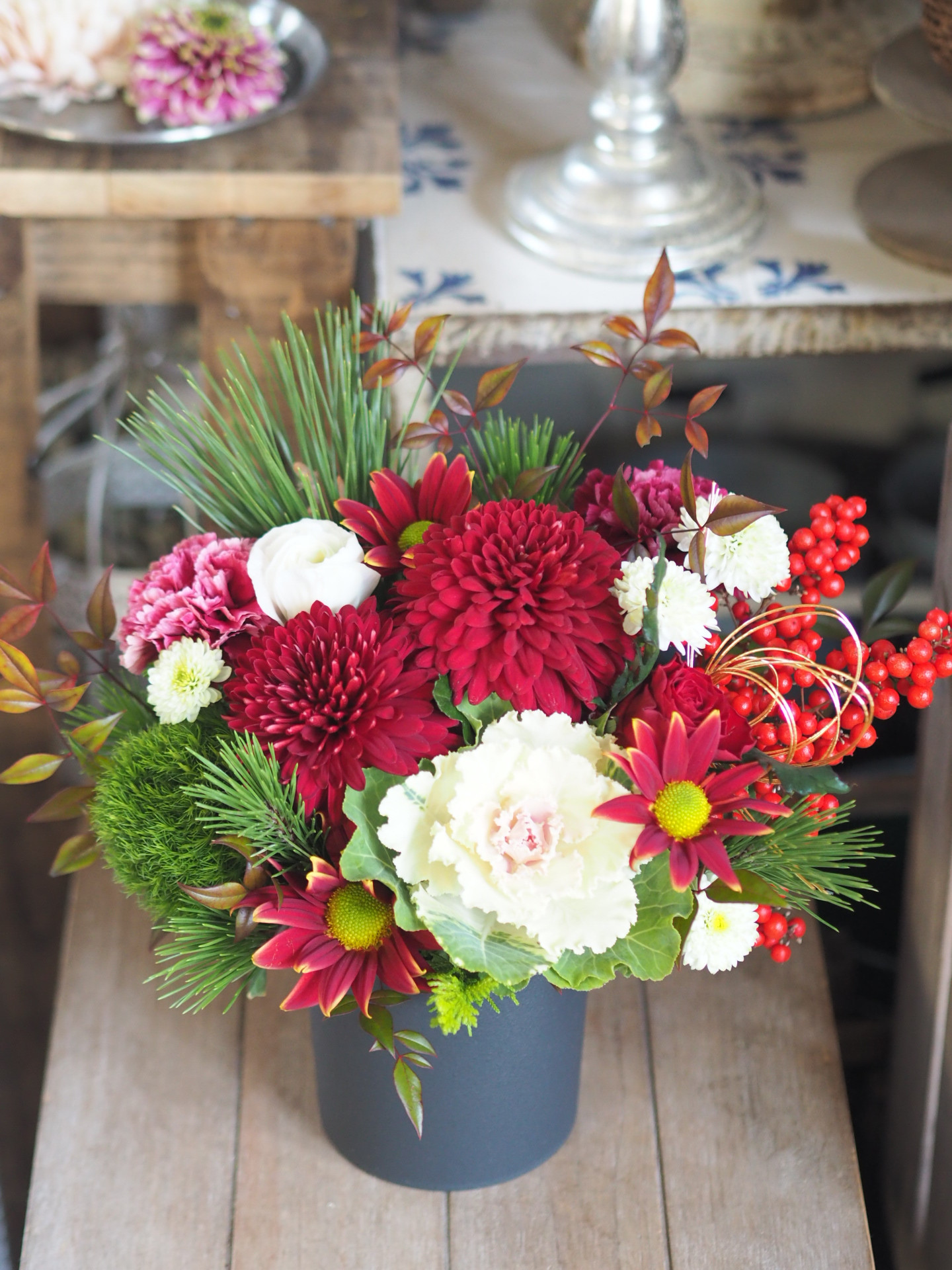 ②レッド… 赤系のお花を中心としたお正月らしい華やかなアレンジメント